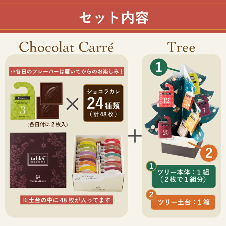 横浜のチョコレート専門店バニラビーンズがお届けするショコラカレ・アドベントカレンダーは、クリスマスまでをカウントダウンしながら、毎日違ったフレーバーのチョコレートをお楽しみいただけるクリスマス限定商品です。